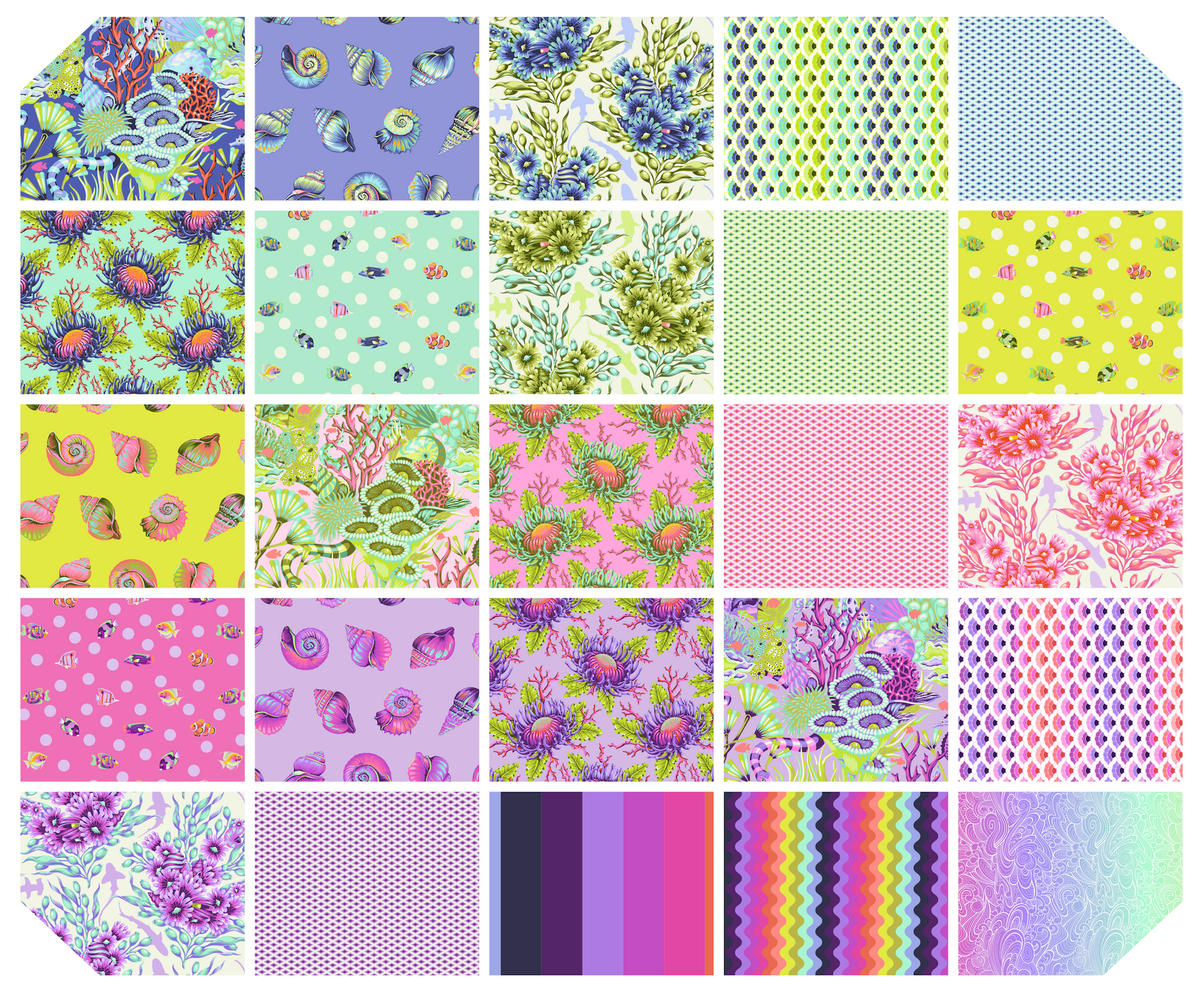 Add a splash of ocean-inspired color to your quilting with the Floral Reef Charm Pack. This pack includes pre-cut 5" squares featuring the entire Floral Reef collection by Tula Pink—vivid seashells, coral, fish, and underwater botanicals in Tula’s signature bold palette. Perfect for patchwork, smaller projects, or for sampling the full line without committing to yardage.