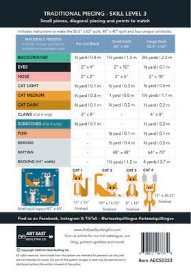 Cat Scratch Quilt Pattern Booklet. Confident piecer (skill level 3) - small pieces, diagonal piecing and points to match. This pattern includes the instructions to create a unique quilt featuring cats and fish in two sizes, 55.5in x 62in and 40in x 40in. This quilt is traditionally pieced. The pattern is laid out in a way that also allows you to create any of the four different cat blocks individually for other projects or different quilt layouts. A background fabric cutting guide layouts. A background fabric cutting guide layout is also included to make the most of your fabric while cutting for either the small or large quilt. The cat blocks vary in size from 8in x 16in to 13in x 36.25in. The pattern is 32 pages, printed in full color and saddle stitched with a soft laminate cover.