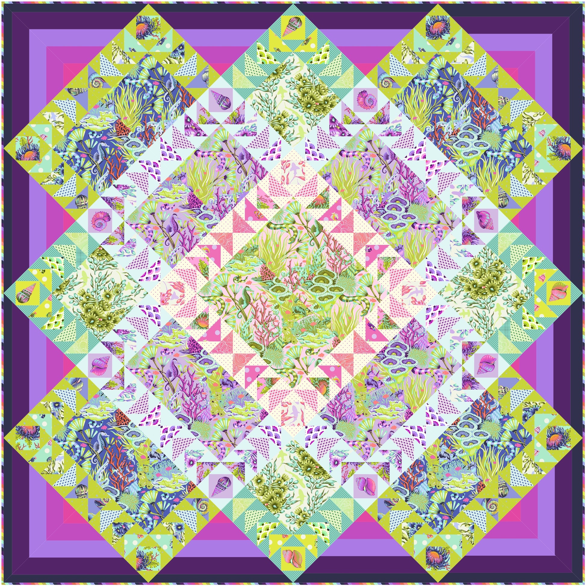 The bold medallion-style design, framed by vibrant borders, highlights the movement and depth of the ocean—perfect for quilters who love precision piecing and dynamic layouts. Whether displayed as a showpiece or gifted as a treasure, this quilt is destined to make a splash.