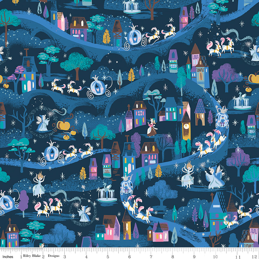 Romantic castle silhouettes sparkle under a starlit sky in this dreamy print. Ideal for fussy cutting or as a dramatic quilt background.